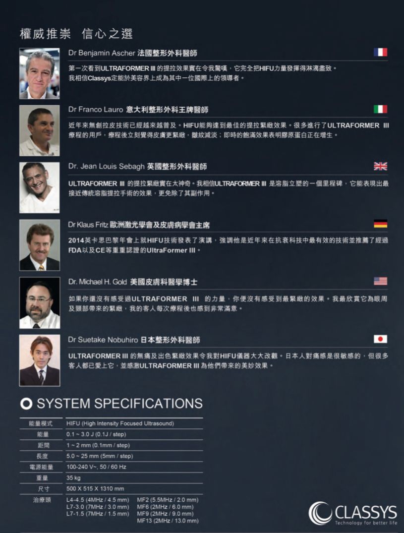 HIFU技術榮獲2009年美國FDA核准,HIFU採用非光學能量,超聲波以聚焦方式產生可高達攝氏60-70度的熱能,從而肌膚產生熱凝固效應,皮膚膠原蛋白及SMAS立即性的收縮,刺激膠原蛋白再生,不會對表層皮膚造成任何損害。