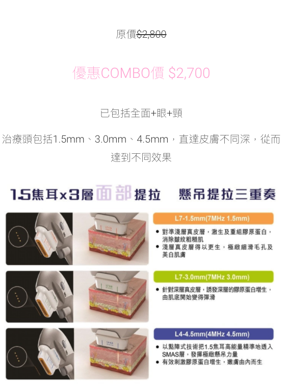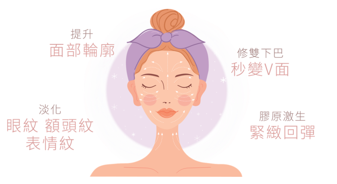 治療的範圍包括鬆弛的下眼袋、魚尾紋、雙下巴、蘋果肌等